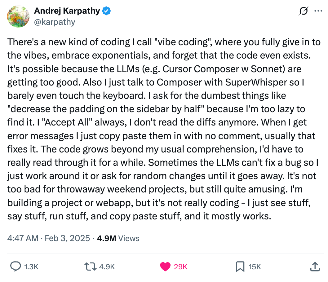 This tweet by Karpathy gave name to the way half of us are secretly building projects now. You talk to your code (literally), accept all LLM suggestions without reading, copy-paste error messages, and pray it works. And guess what? It mostly does. For solo indie hackers, this lazy genius flow might just be the future.
